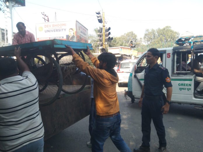 सार्वजनिक मार्गों और फुटपाथों पर अतिक्रमण कर यातायात व्यवस्था में बाधा उत्पन्न करने वालों के विरुद्ध दून पुलिस का अभियान लगातार जारी है। सोमवार को यातायात पुलिस देहरादून ने नगर निगम के सहयोग से परेड ग्राउंड के चारों ओर व्यापक अतिक्रमण विरोधी अभियान चलाया।
