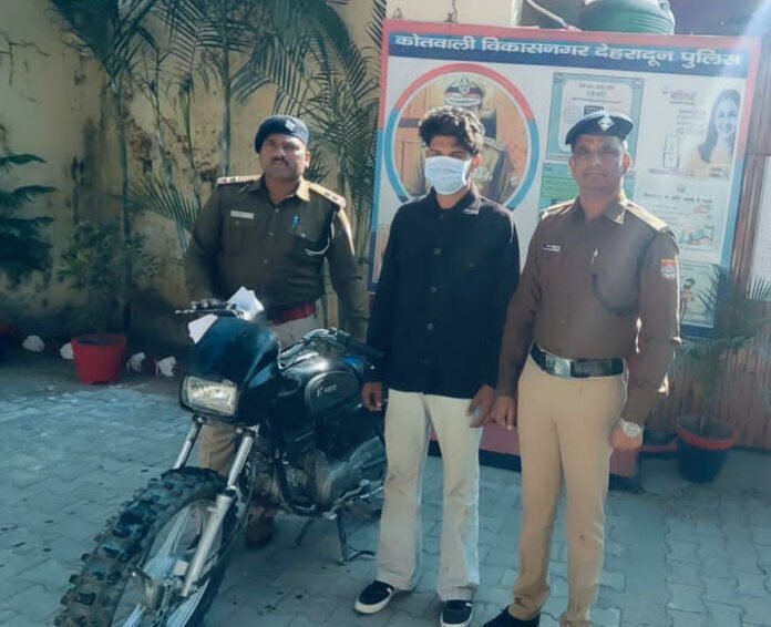 विकासनगर क्षेत्र में हुई वाहन चोरी की घटना को देहरादून पुलिस ने सुलझा लिया है। कोतवाली विकासनगर पुलिस ने चोरी की गई सुपर स्प्लेंडर मोटर साइकिल संख्या यूके-16- एफ -7496 बरामद करते हुए 19 वर्षीय फरदीन खान को गिरफ्तार किया है।